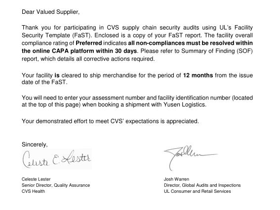 創(chuàng)思維驗(yàn)廠沒有辜負(fù)工廠領(lǐng)導(dǎo)的信任,以快速、有效的驗(yàn)廠方法與手段一次性順利通過UL 驗(yàn)廠,一舉拿下VCS訂單,客戶滿意的寫下下列郵件: