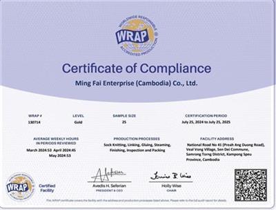 在創思維驗廠網老師專業技術、全程跟進耐心細致輔導以及公司全體員工配合下,一次性順利通過WRAP認證,為將來公司發展奠定了良好的發展基礎,既開拓了市場同時也增加了消費者對公司的信賴,在這里再次祝賀Ming Fai Enterprise (Cambodia) Co., Ltd.柬埔寨工廠2024年一次性成功通過WRAP認證,同時也期待未來再次與創思維驗廠網合作!